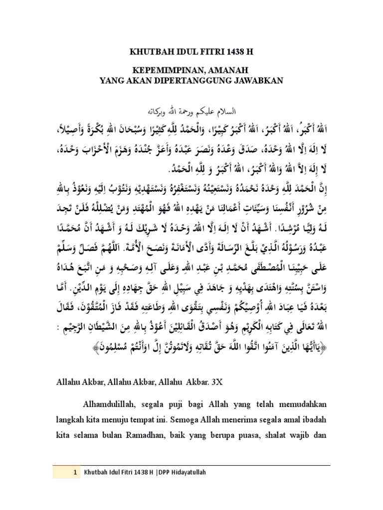 Khutbah Idul Fitri 1438 H Dpp Hidayatullah